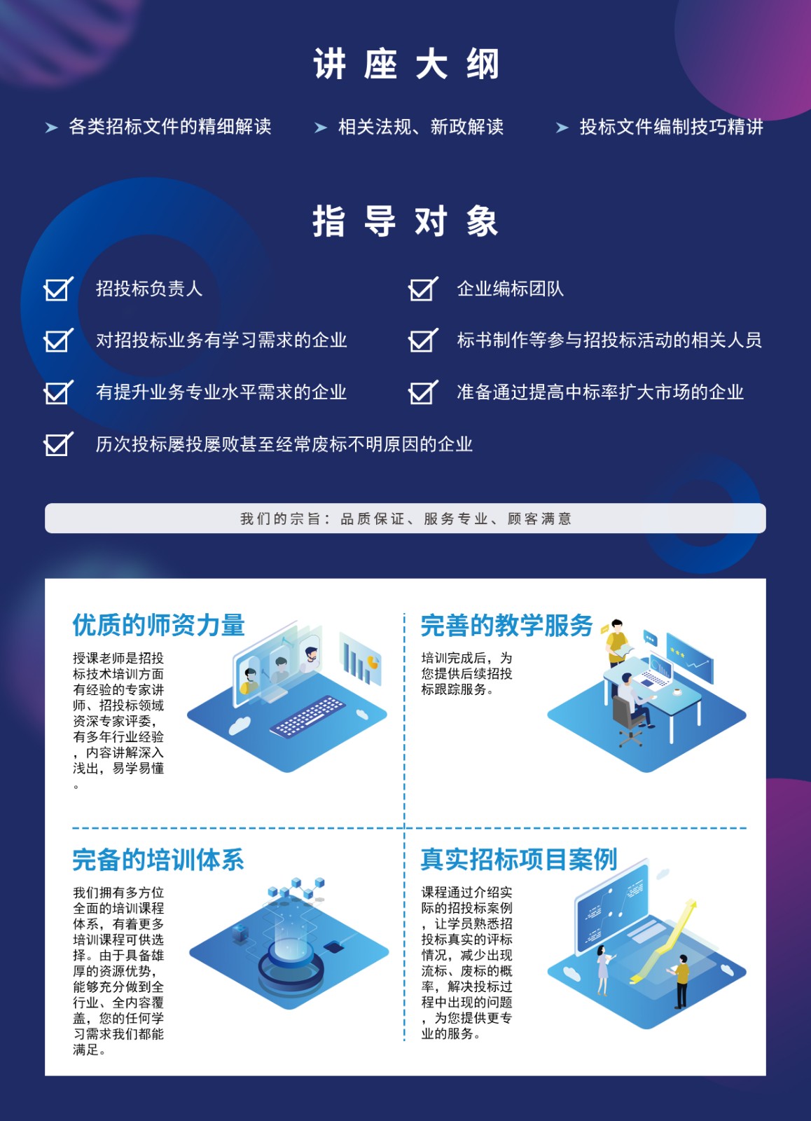對招投標業(yè)務有學習需求的企業(yè),包括企業(yè)編標團隊、招投標負責人、標書制作等參與招投標活動的相關人員,特別是有提升業(yè)務專業(yè)水平需求、準備通過提高中標率擴大市場、歷次投標屢投屢敗甚至經(jīng)常廢標不明原因的企業(yè)。